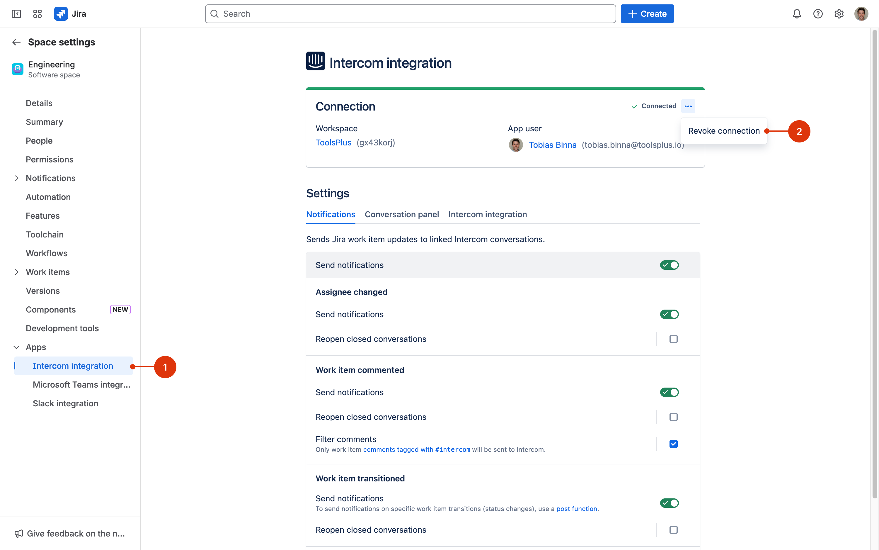 Back in Jira, open the space settings and click on **Apps → Intercom integration (1)** in the left-hand menu. Then, click on the **context menu button ⋯ →** **Revoke connection (2)** to revoke the connection to Intercom.&#x20;