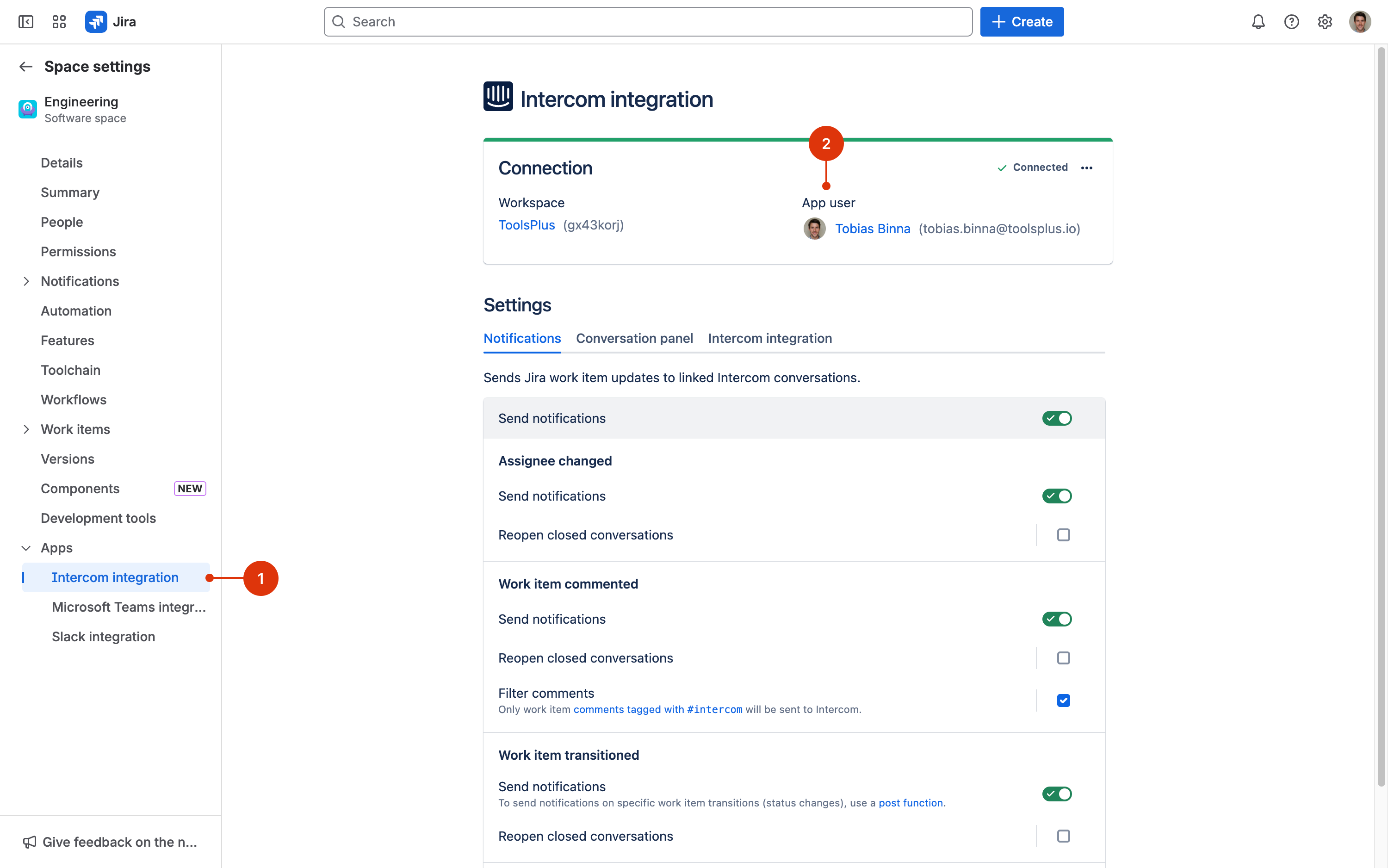 You can find the currently configured app user for any Jira space by opening the Jira space settings and clicking on **Apps → Intercom integration (1)** in the left-hand menu. If the Jira space is connected to Intercom, the app user is displayed under **App user (2)**.