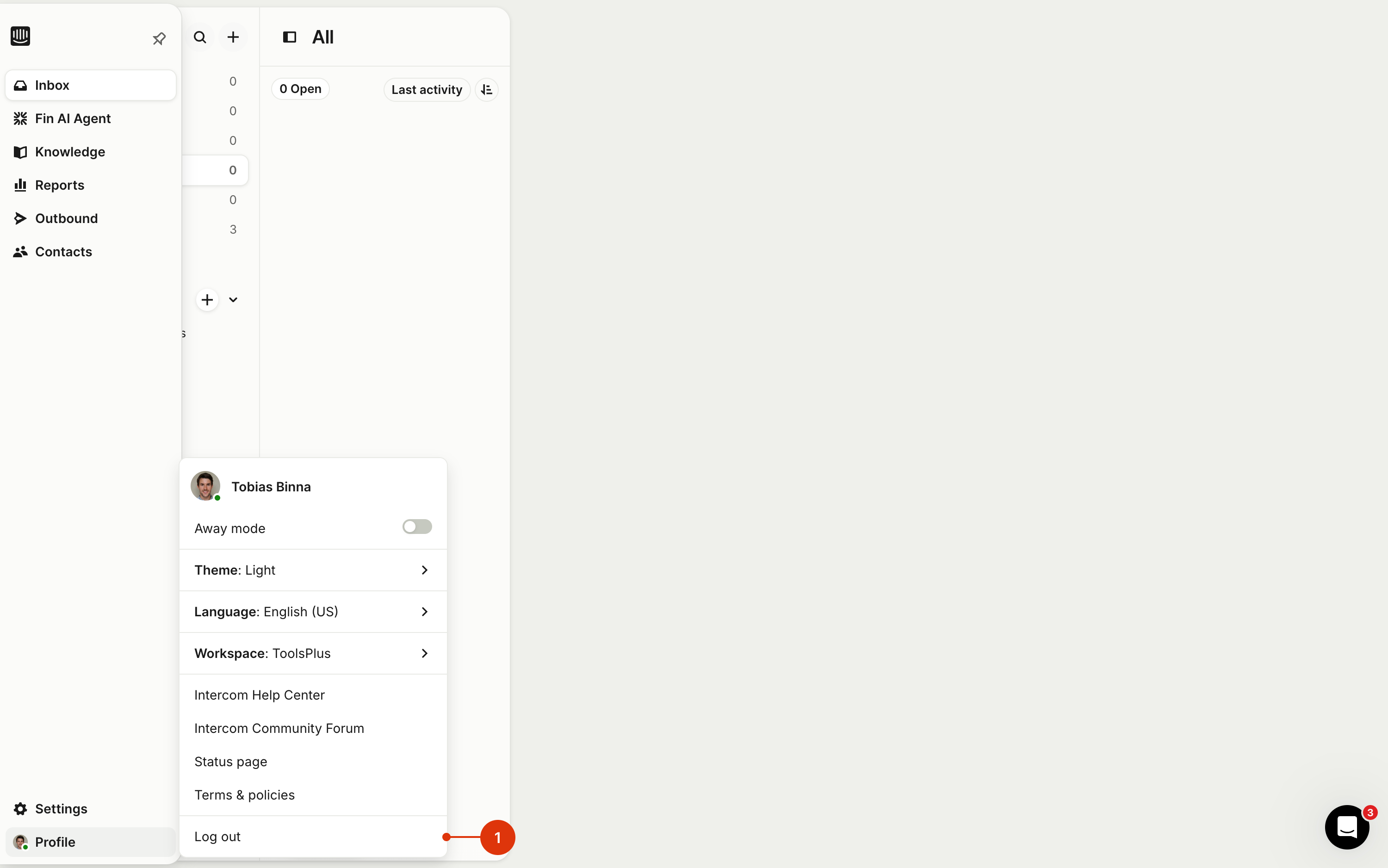 Open Intercom in your browser, click on Profile in the bottom right corner, then click **Logout (1)**.