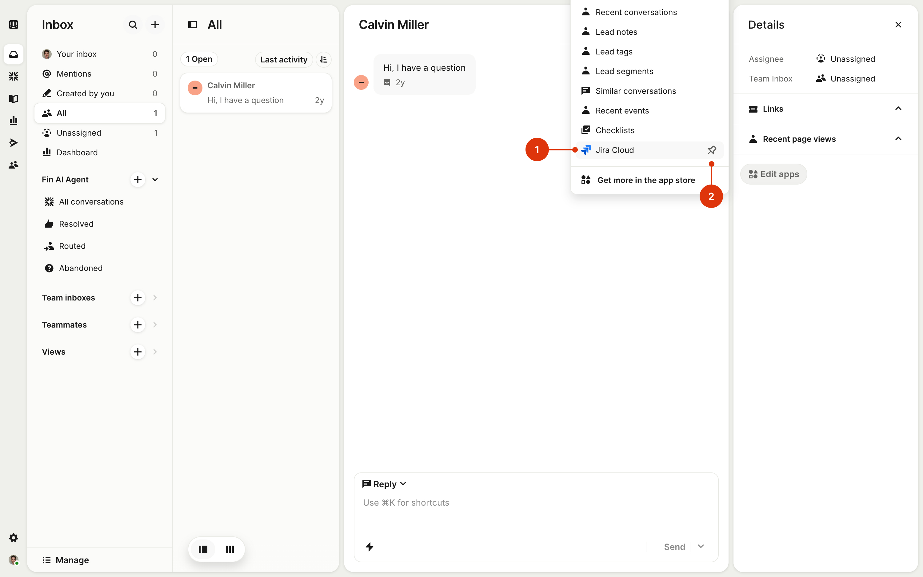 Note that adding the Jira Cloud app to your Intercom Inbox will not automatically add it to your teammates' Inboxes. Each Intercom teammate will have to add the app themselves.